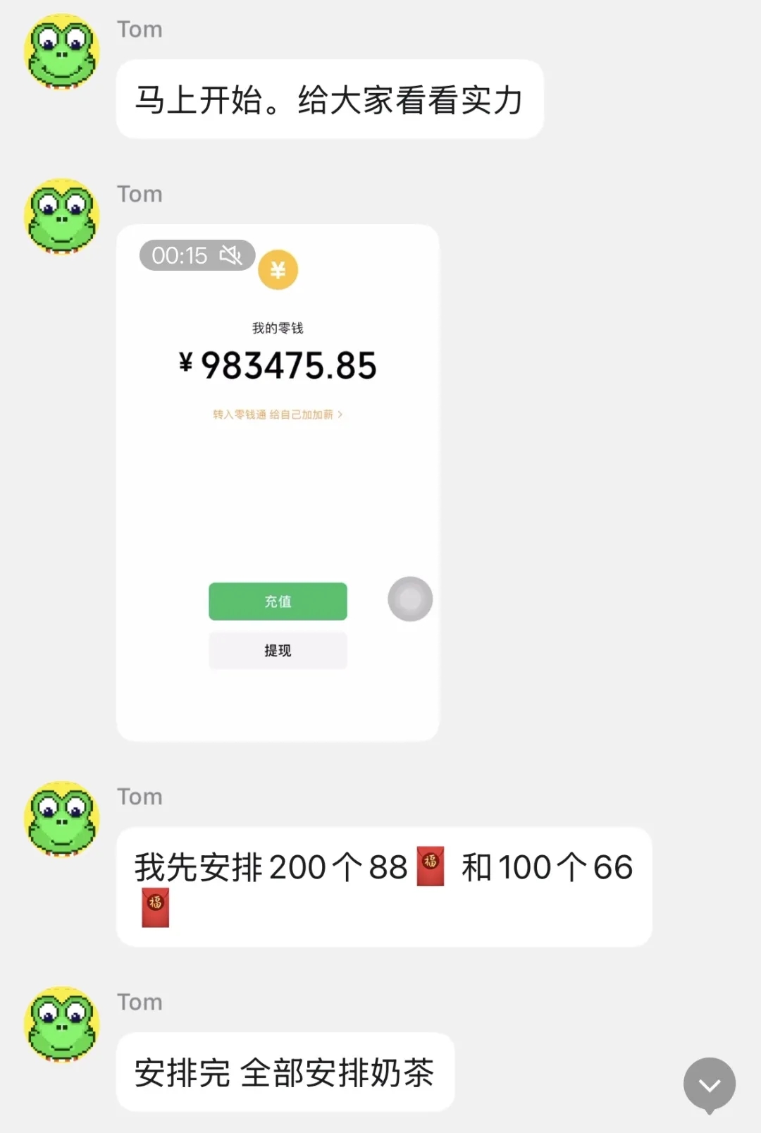 然后他的配文是:“新年第一天,发XXX个红包,先到先得。”之类的话术,或者是“今天基金赚了多少,分出来大家众乐乐。”